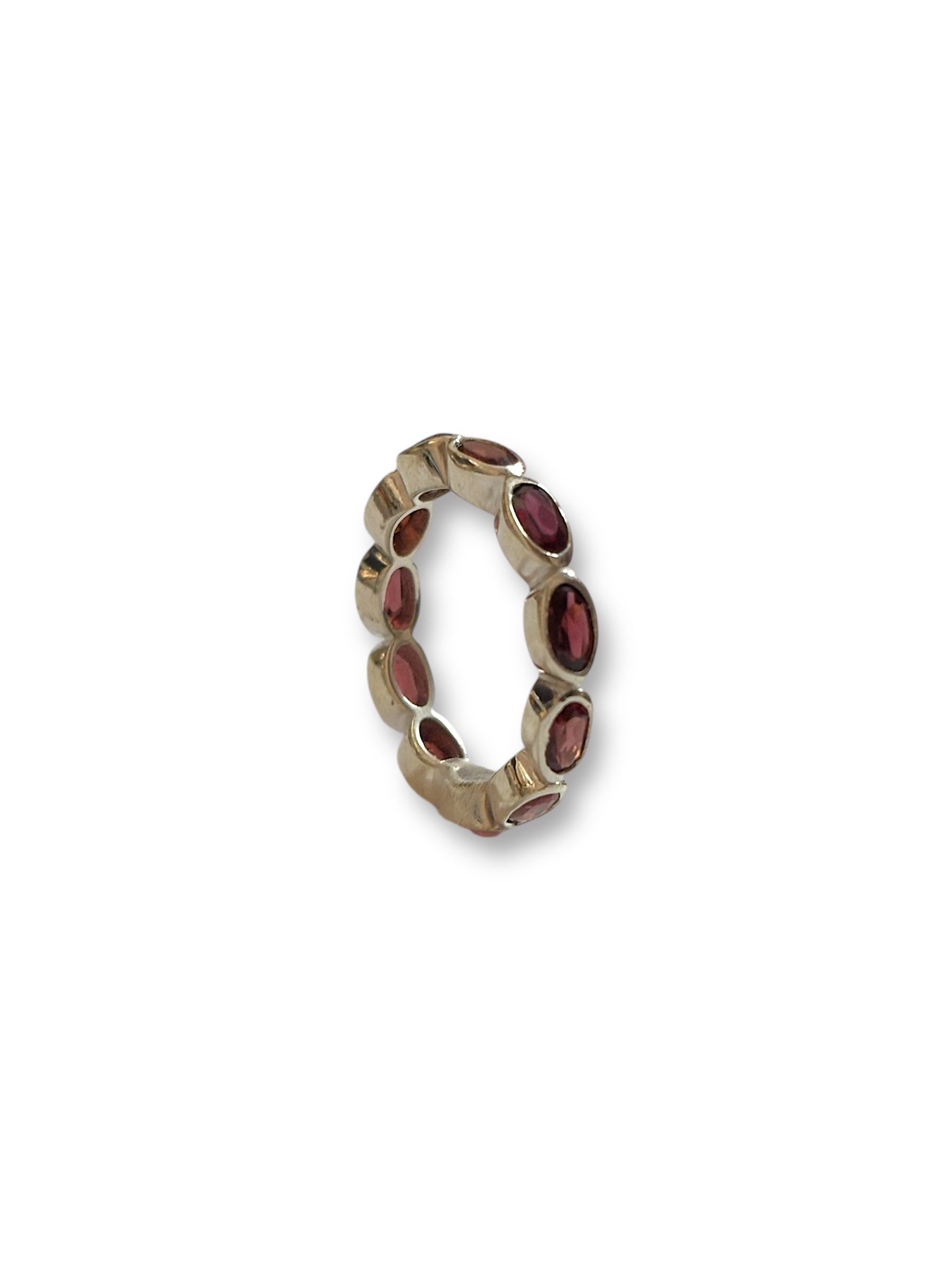 Rich and radiant, the Crimson Loop ring is handcrafted in hallmarked 925 sterling silver and set with a continuous line of faceted garnet stones, known for their deep red glow and energizing warmth. Each stone is bezel-set in a smooth looped band, offering both structure and shine.