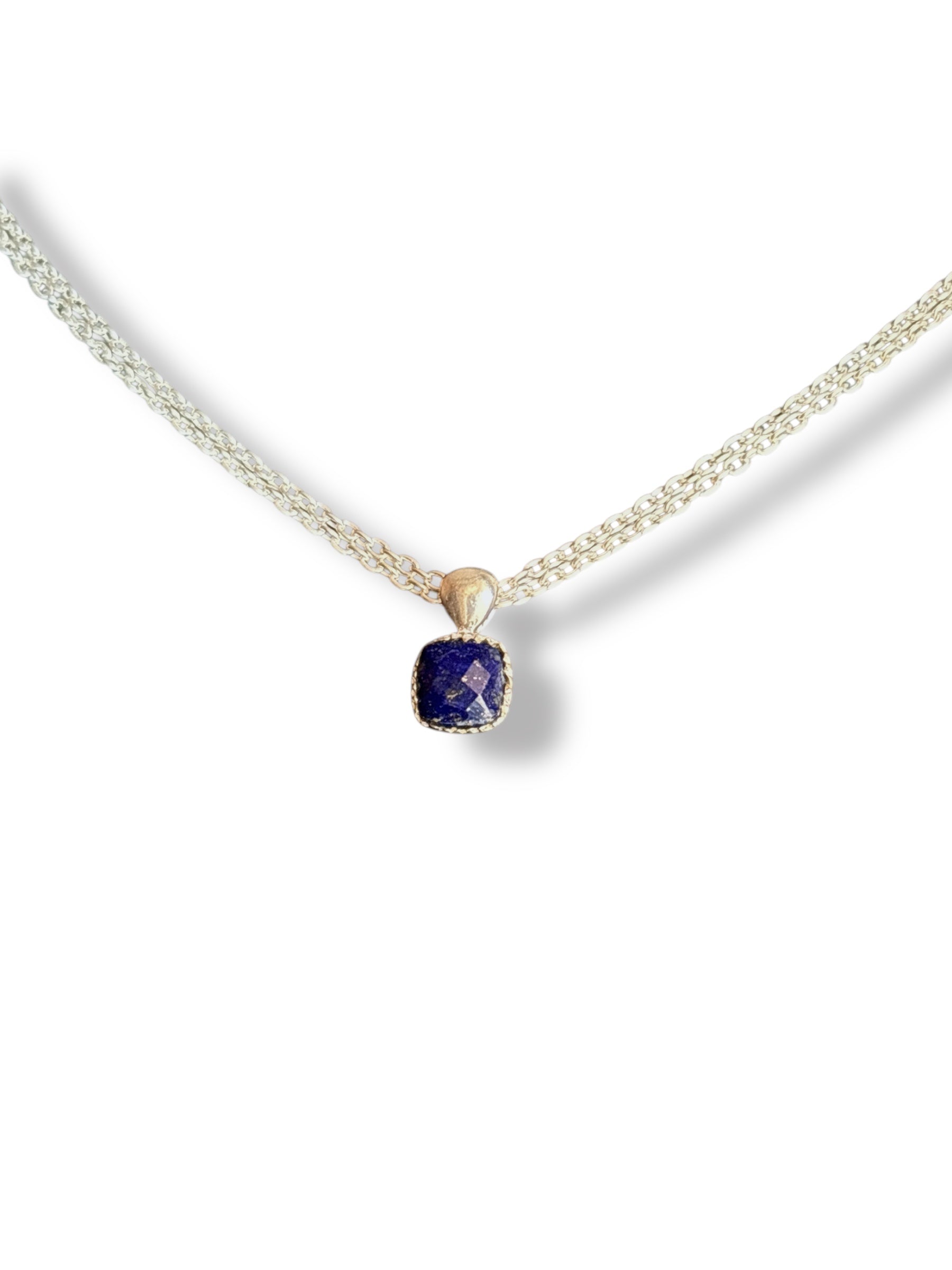 Crafted in high-quality 925 sterling silver, the Indigo Whisper pendant features a cushion-cut lapis lazuli known for its rich indigo hue and natural golden specks. The gemstone is handset in a sleek bezel frame and suspended from a fine, durable silver chain that complements both casual and formal outfits.