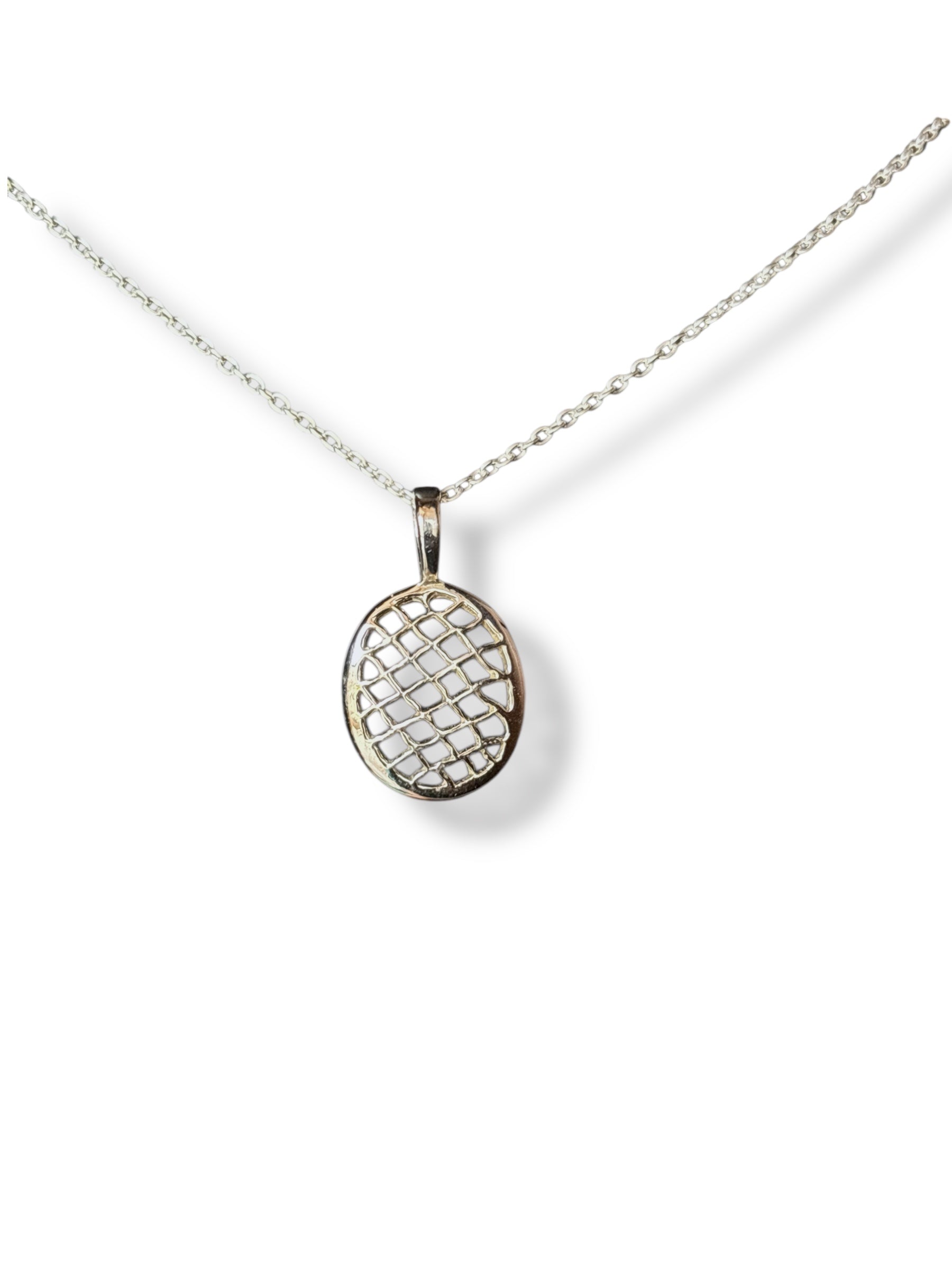 Elegant and airy, the Silver Web Pendant is crafted in hallmarked 925 sterling silver, featuring an oval frame with a delicate openwork web design. The intricate pattern catches the light beautifully, creating a soft shimmer that adds modern sophistication to any look. Lightweight yet striking, this pendant is perfect for both everyday wear and special occasions.